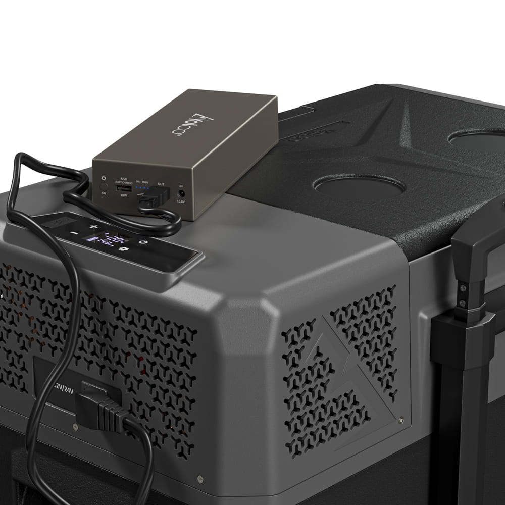 Die modulare Yolco-Batterie ist das ideale Zubehör zur Stromversorgung von tragbaren Kompressorkühlboxen. Die Batterie kann über den Zigarettenanzünder im Auto, eine Steckdose oder die Stromversorgung der tragbaren Kühlbox aufgeladen werden.