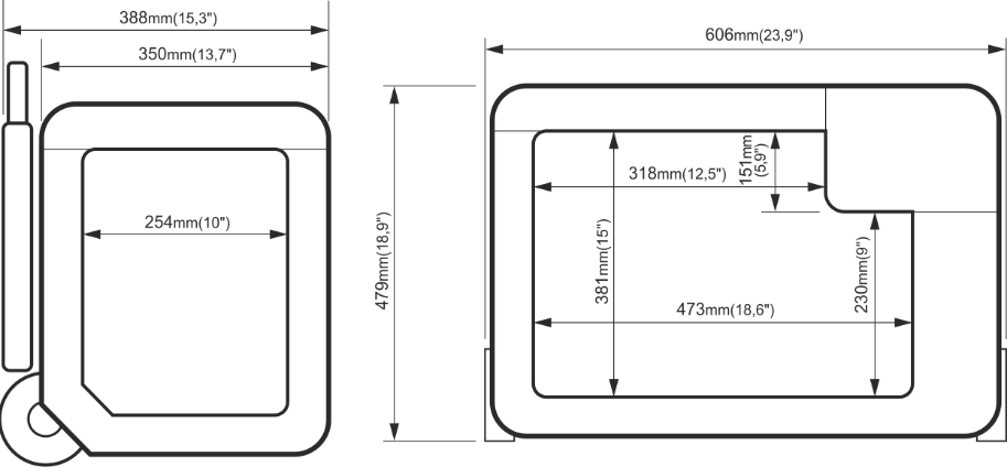 - Abmessungen (B x H x T): 606 x 479 x 388 mm (in Zoll: 23,9″ x 18,9″ x 15,3″)