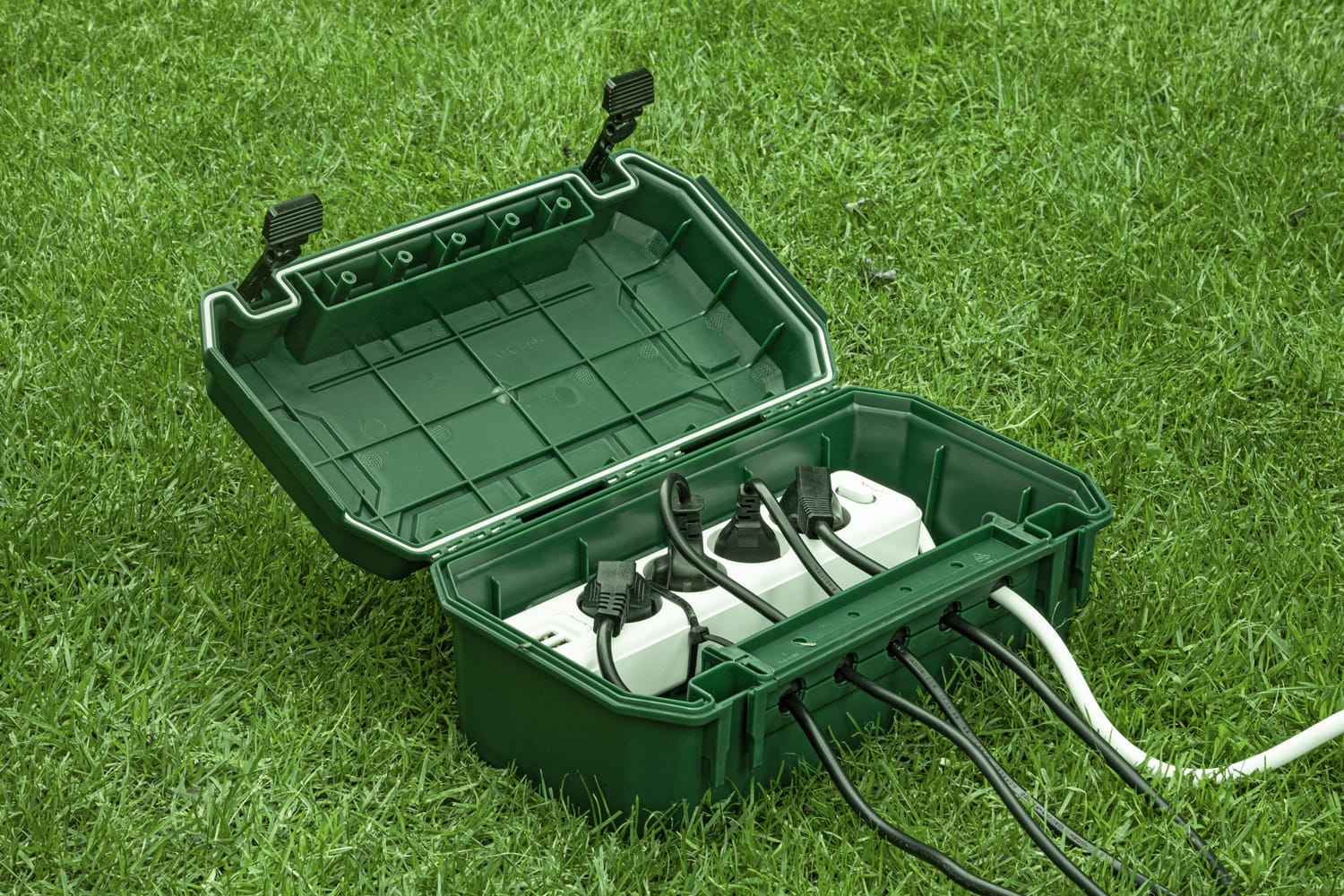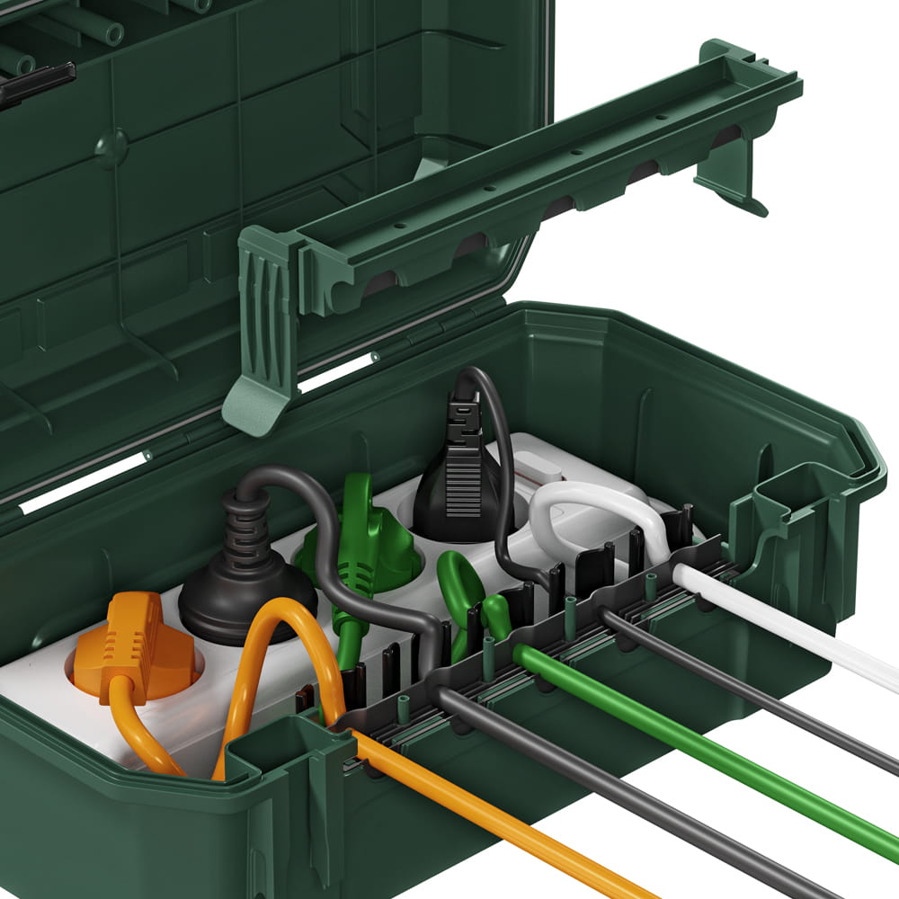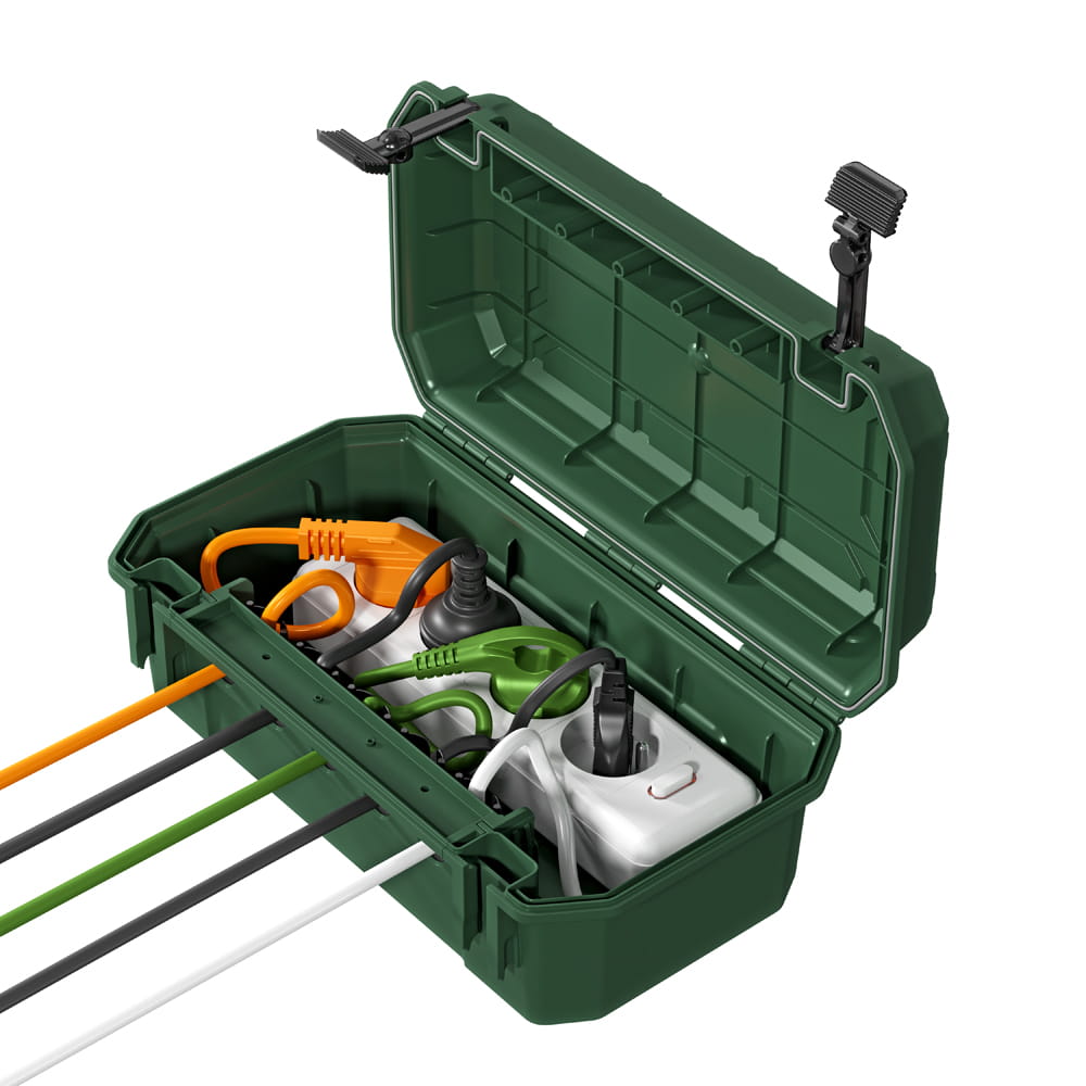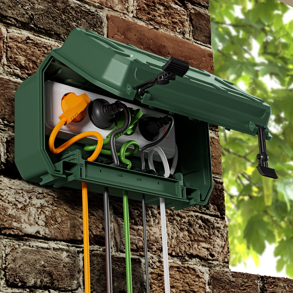 Die Schutzbox von Yolco zeichnet sich durch eine robuste Konstruktion aus hochwertigem Kunststoff aus. Sie bietet Platz für Steckdosenleisten, Kabel, Zeitschaltuhren oder Funkempfänger. Die Box verfügt über Öffnungen, durch die bis zu fünf Elektrokabel herausgeführt werden können (2x⌀ 12,4 mm; 3x⌀ 10,5 mm).