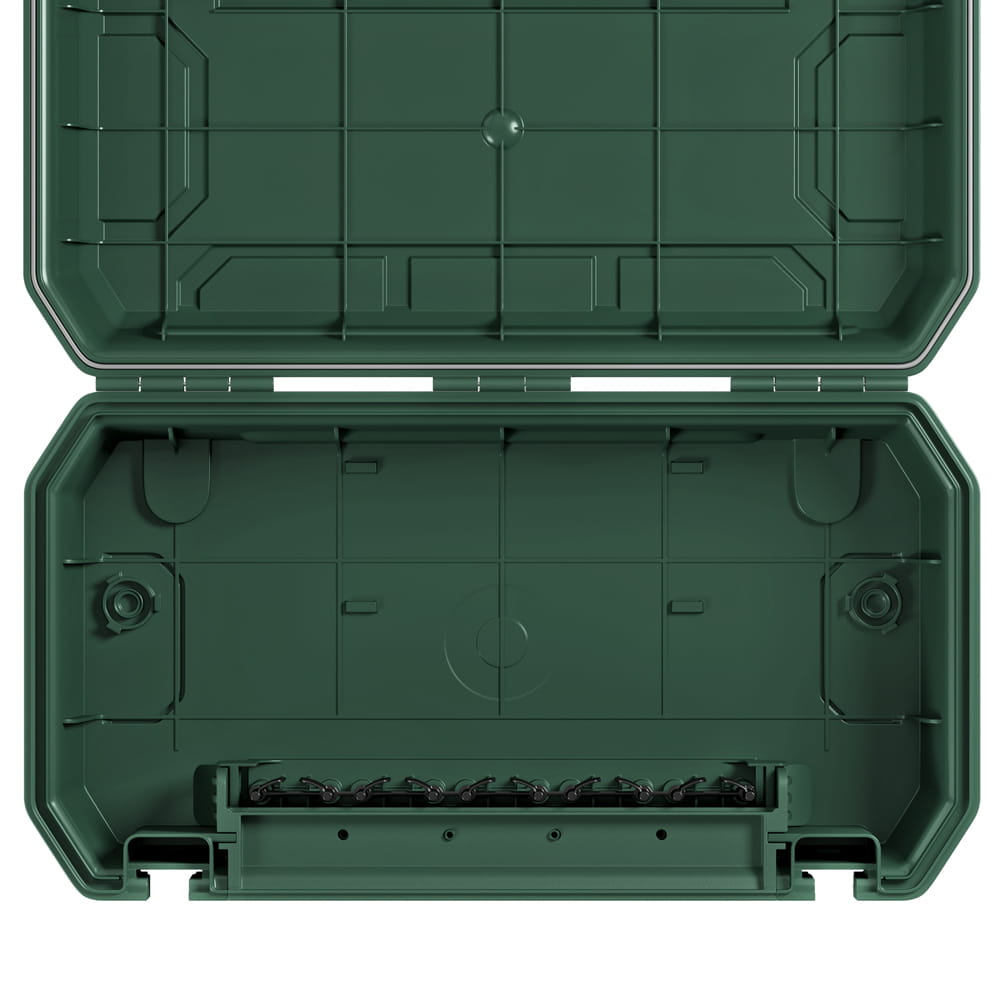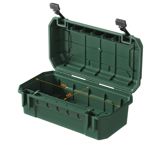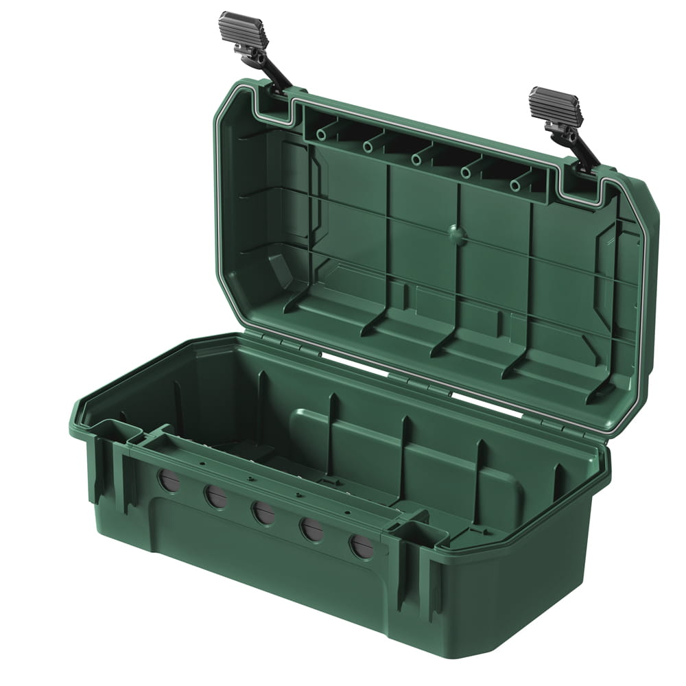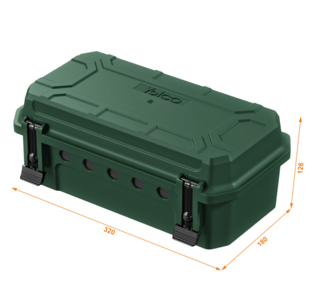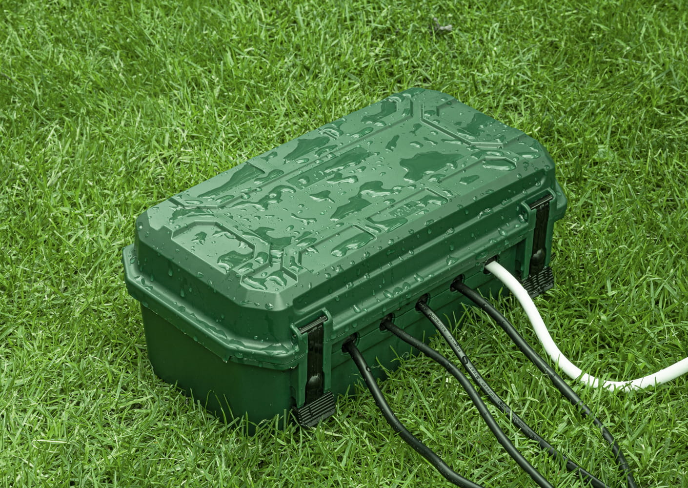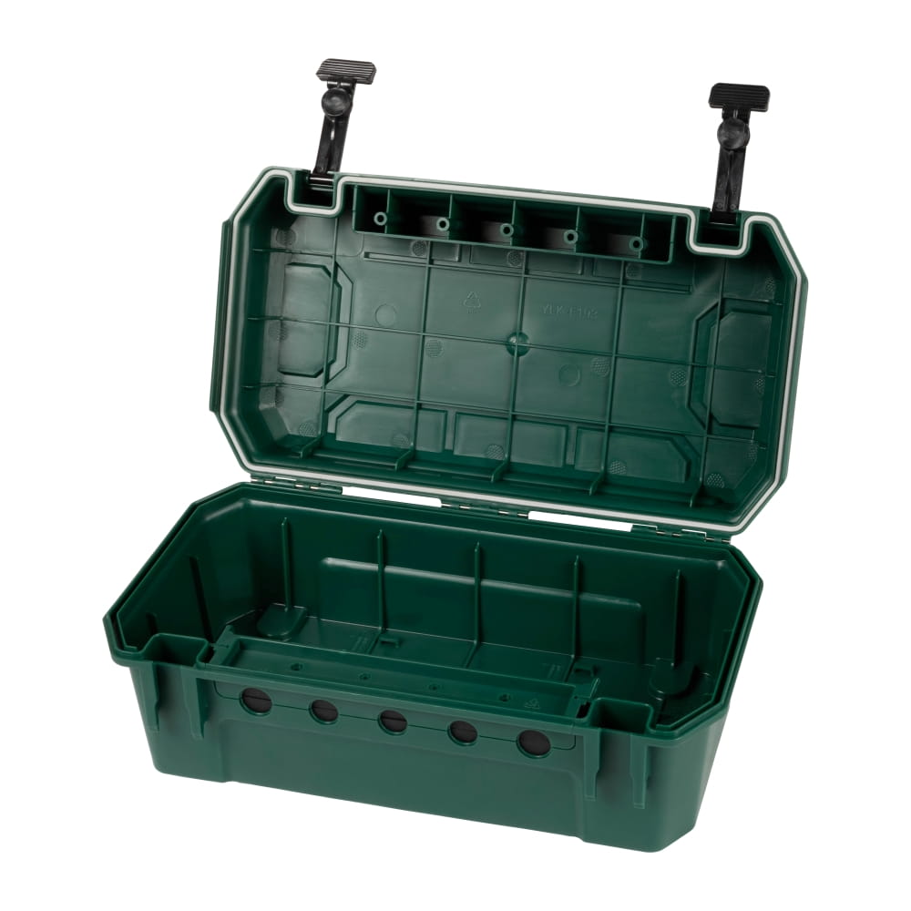Die Schutzbox von Yolco zeichnet sich durch eine robuste Konstruktion aus hochwertigem Kunststoff aus. Sie bietet Platz für Steckdosenleisten, Kabel, Zeitschaltuhren oder Funkempfänger. Die Box verfügt über Öffnungen, durch die bis zu fünf Elektrokabel herausgeführt werden können (2x⌀ 12,4 mm; 3x⌀ 10,5 mm).