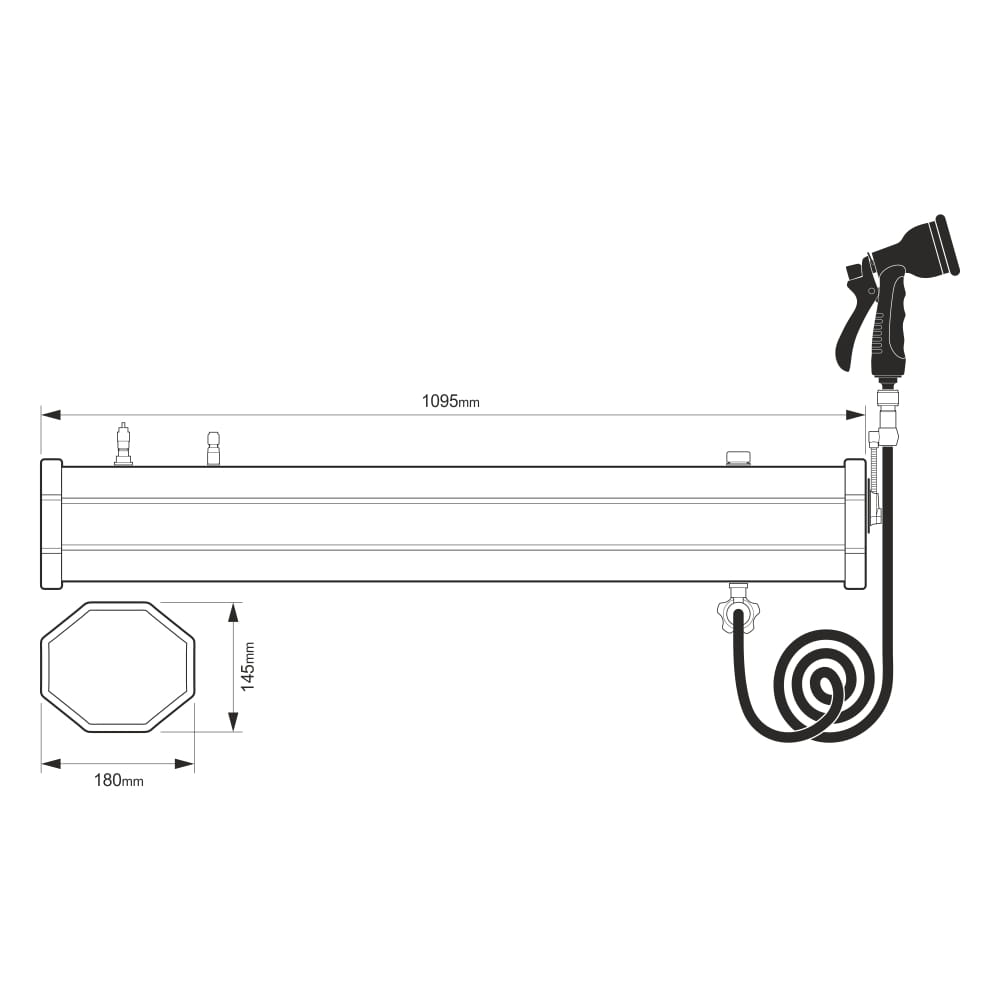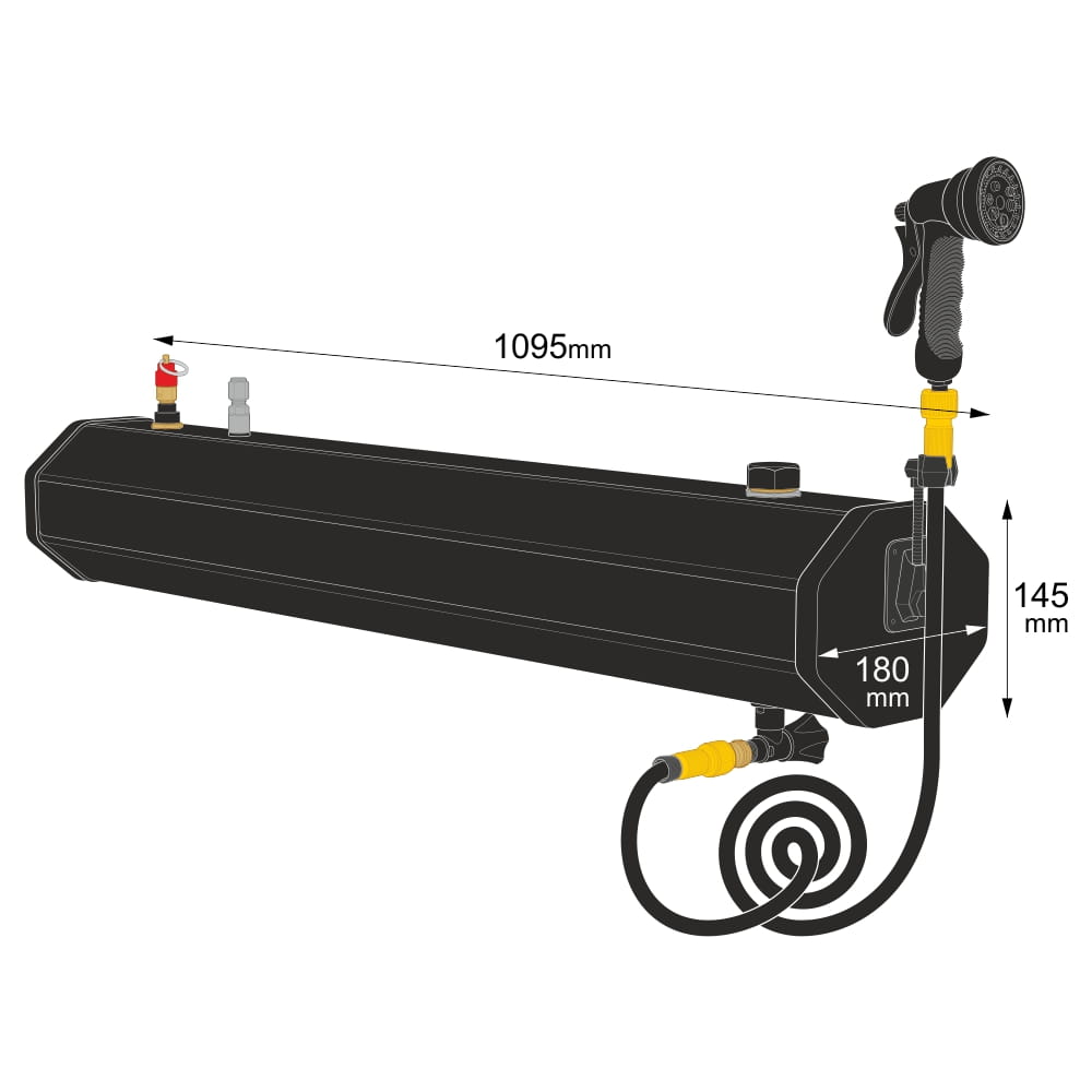 - Tankabmessungen (L × B × H): 1095 × 180 × 145 mm