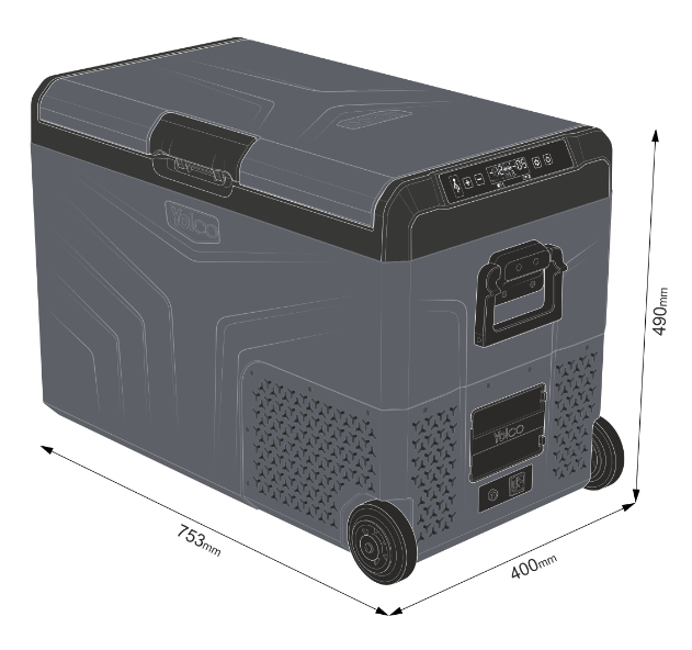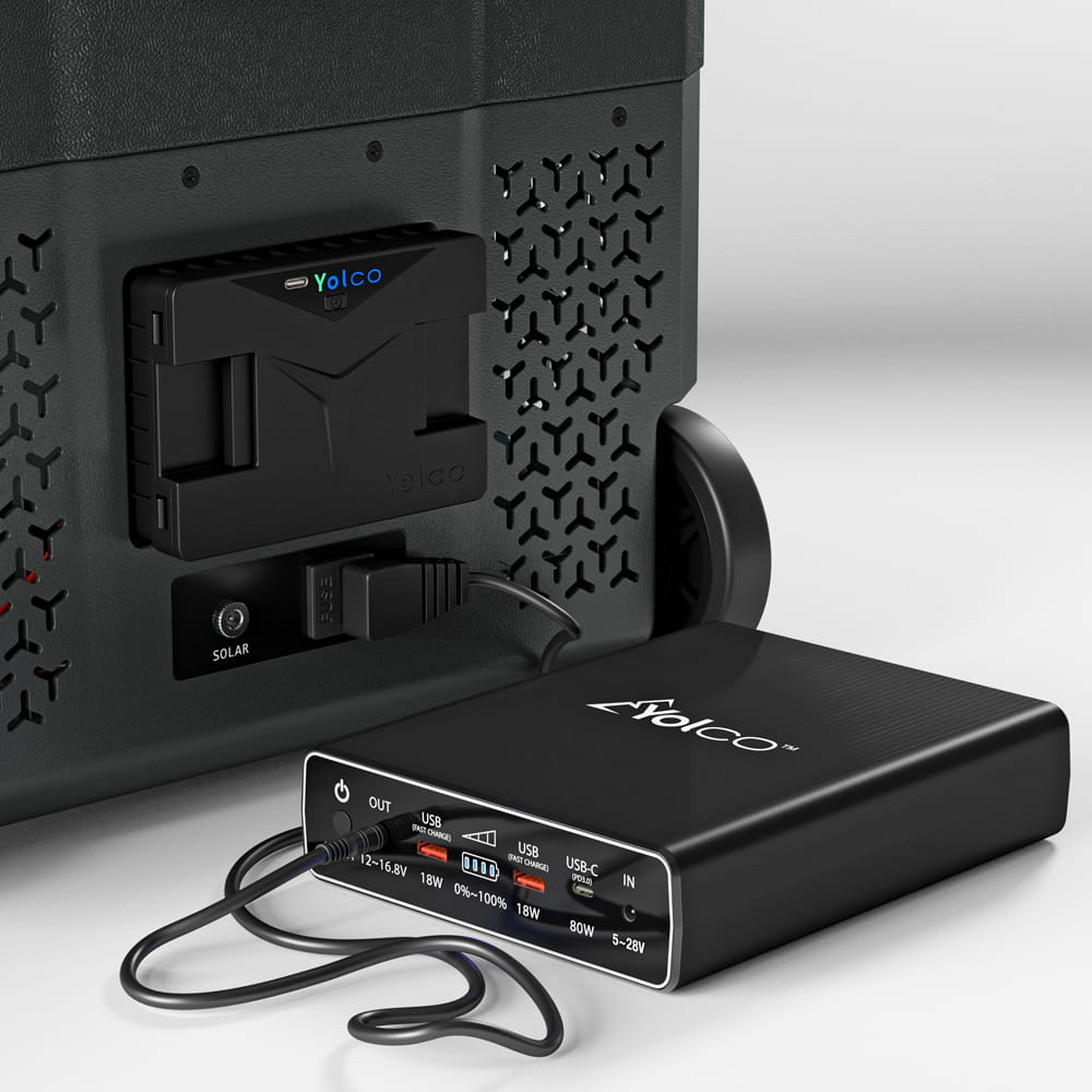 - Dedizierter modularer Akku Yolco SC4 (nicht im Lieferumfang enthalten) — Die Kühlbox ist mit dem entsprechenden Slot ausgestattet.